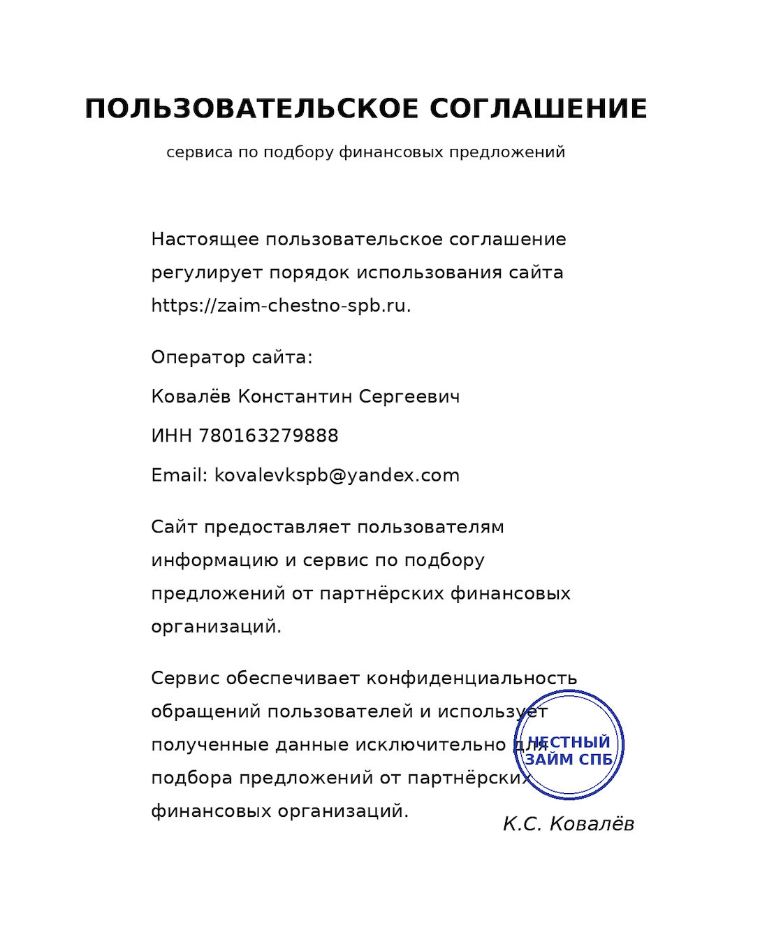 Оператор вправе передавать номер телефона пользователя партнёрским организациям, оказывающим услуги автоломбардов, исключительно для обработки заявки пользователя.